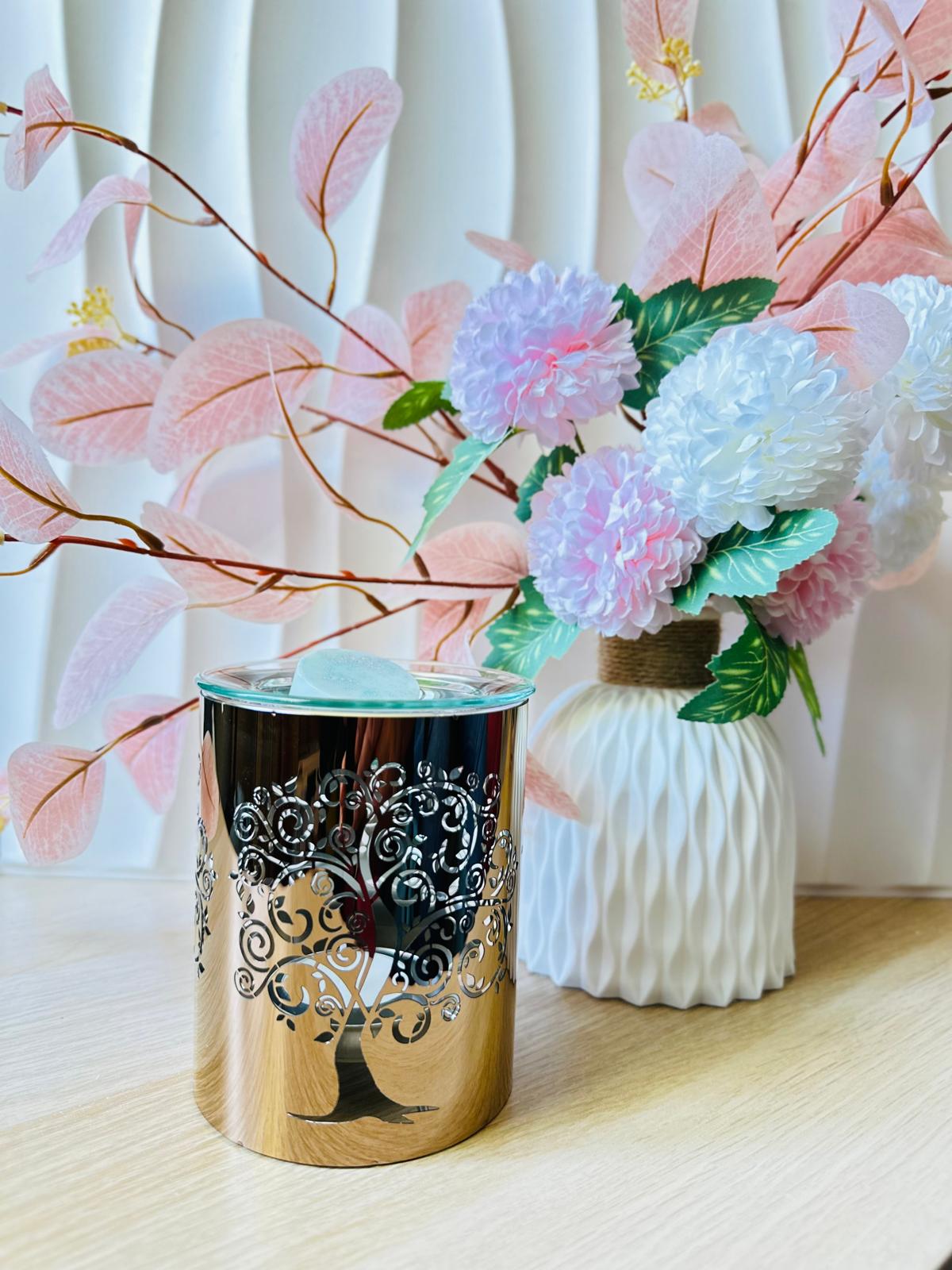 Superbe Brûleur pour fondants parfumés en métal taillé au laser avec coupelle en verre.