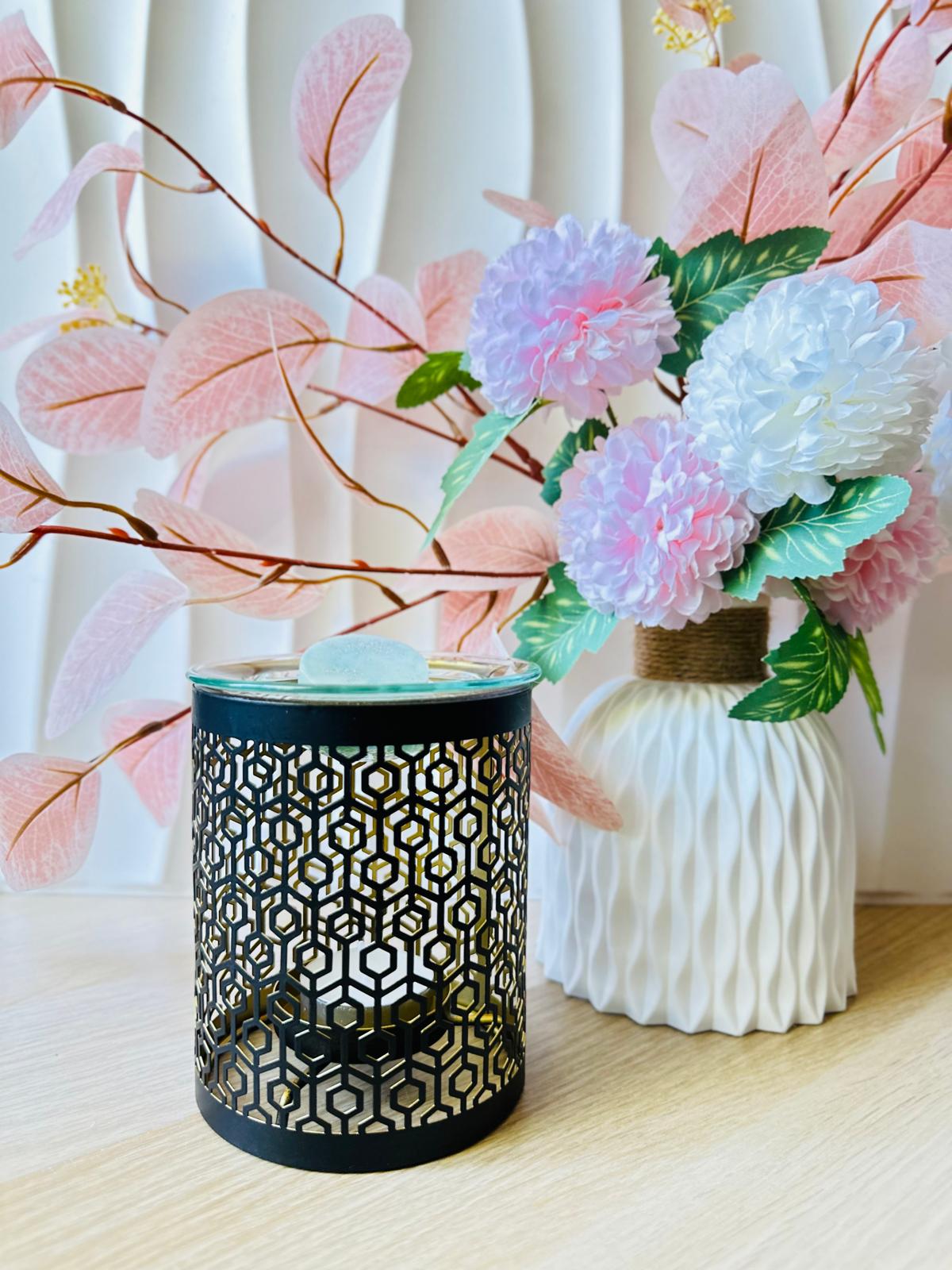Superbe Brûleur pour fondants parfumés en métal taillé au laser avec coupelle en verre.